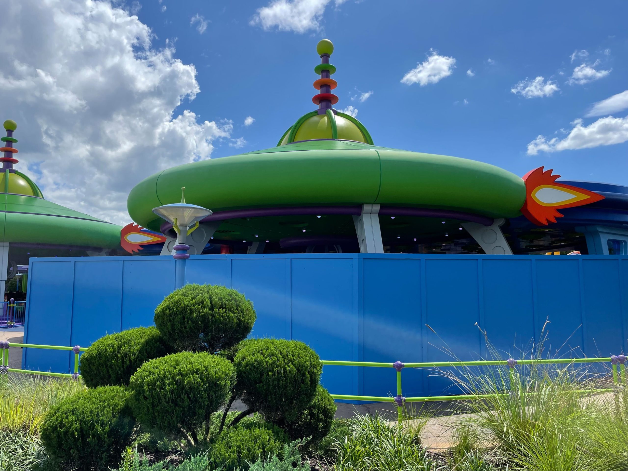 Half of Alien Swirling Saucers in Toy Story Land at Disney’s Hollywood Studios is closed and surrounded by construction walls. ...