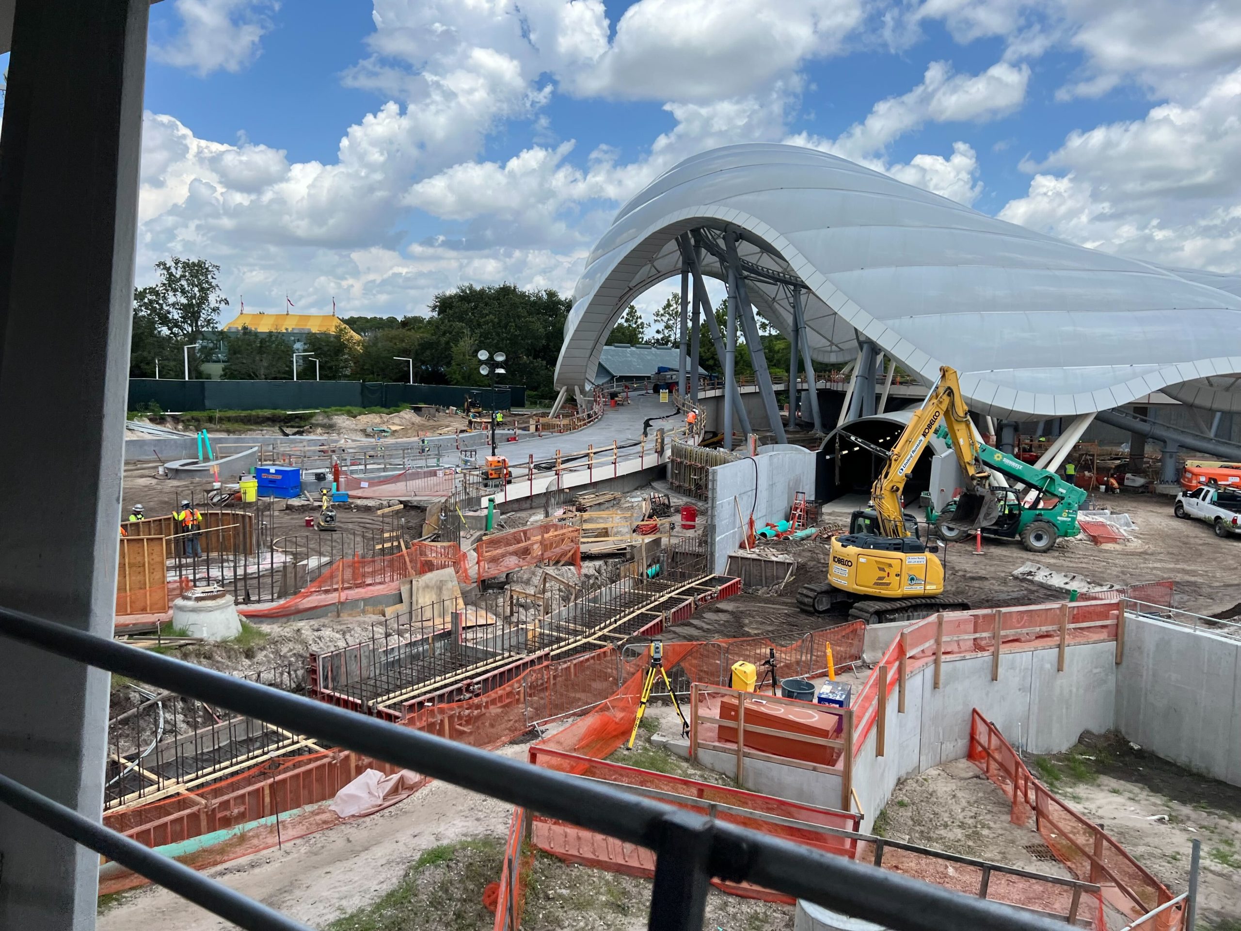Metal Frame Added to Tomorrowland Light & Power Co. Corner, Lower Walkway Foundation Visible at TRON Lightcycle Run at Magic Kingdom