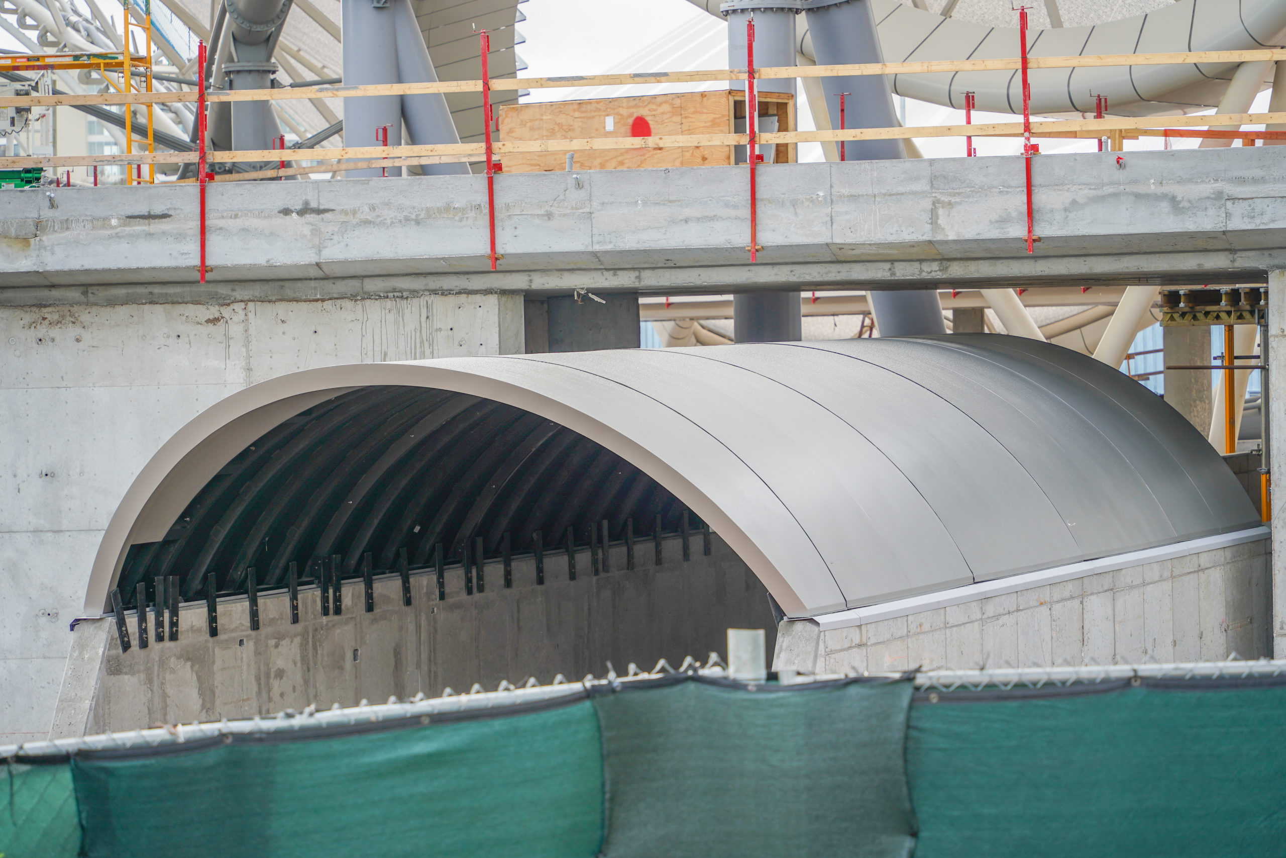 With TRON Lightcycle / Run towering above, construction continues on the Walt Disney World Railroad tunnel in Tomorrowland at Magic ...