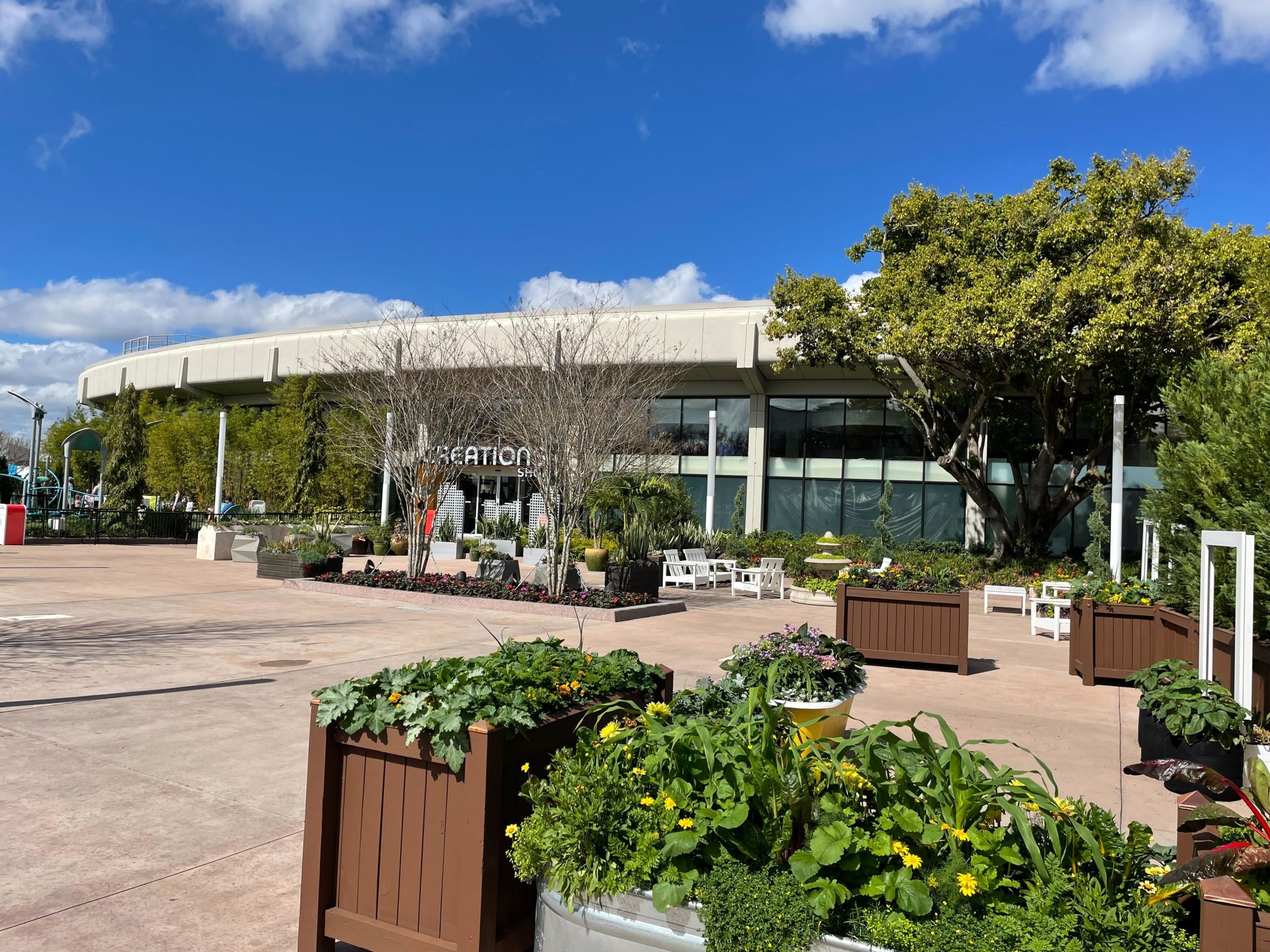 New Garden Seating Area Added Outside Creations Shop at EPCOT for 2022 International Flower & Garden Festival
