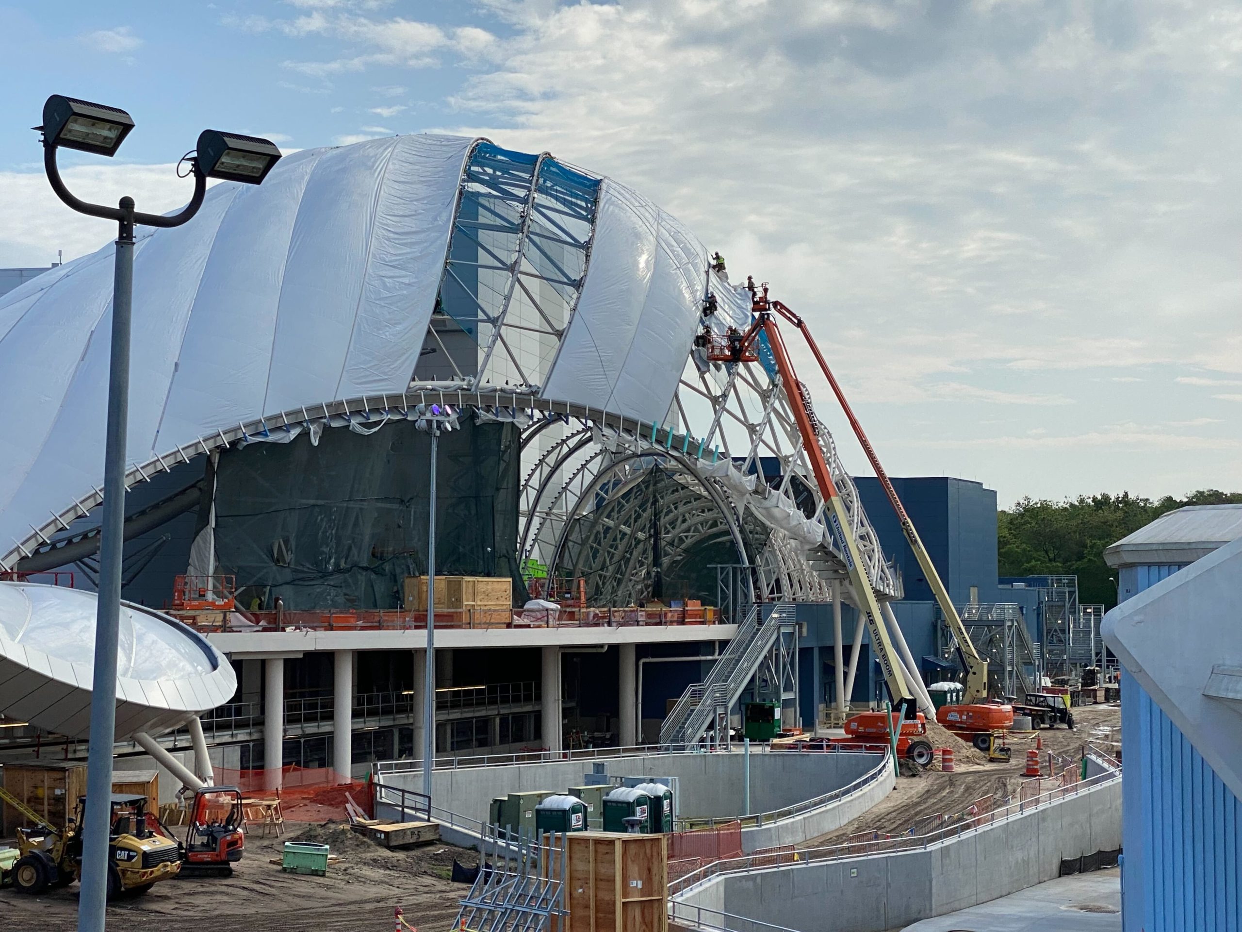Canopy installation is almost complete above TRON Lightcycle / Run in Magic Kingdom. Crew members were unfurling another white canopy ...