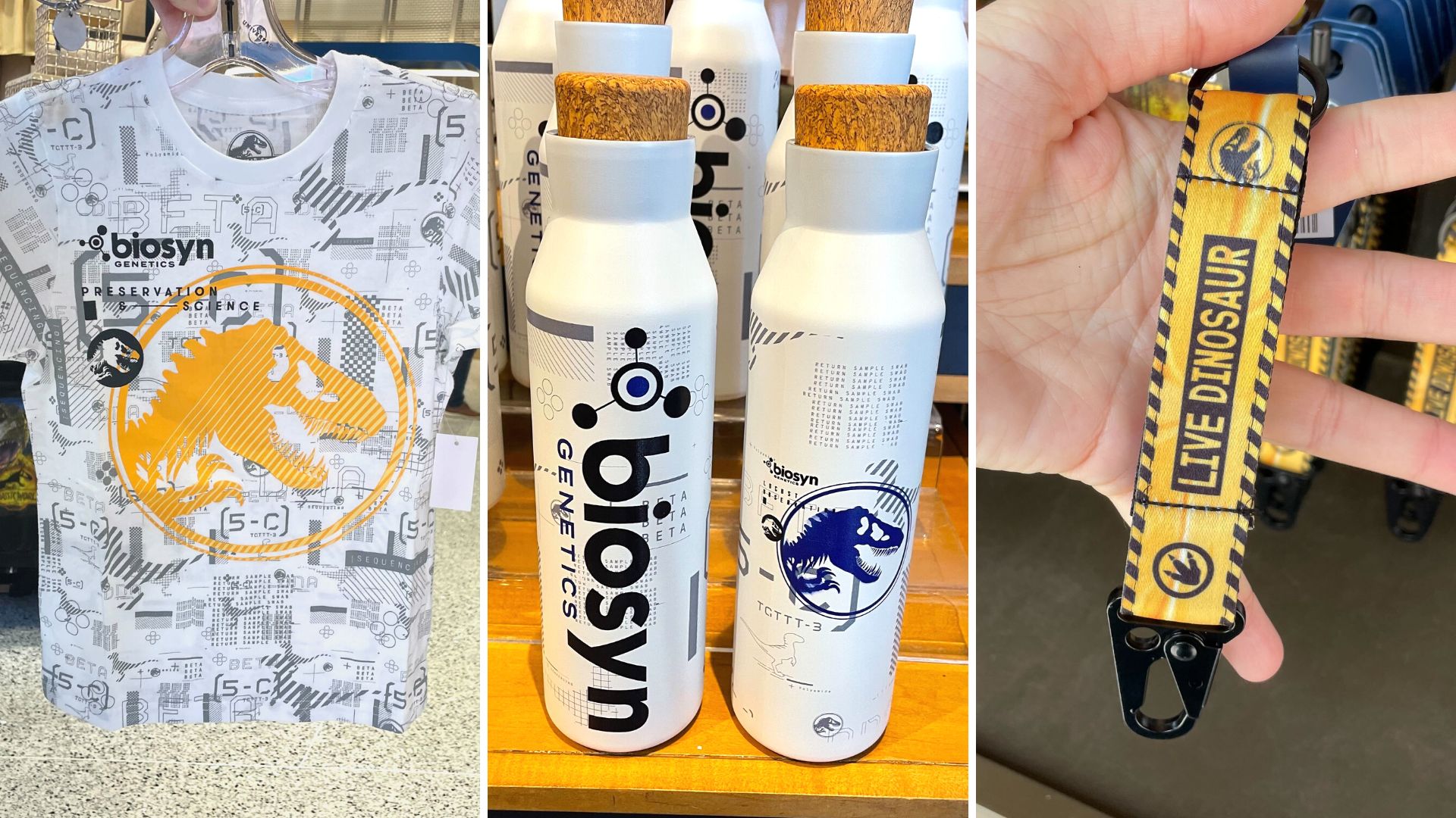 New Biosyn Genetics Bottle and Shirt, ‘Jurassic World’ Bag Charm at Universal Orlando Resort