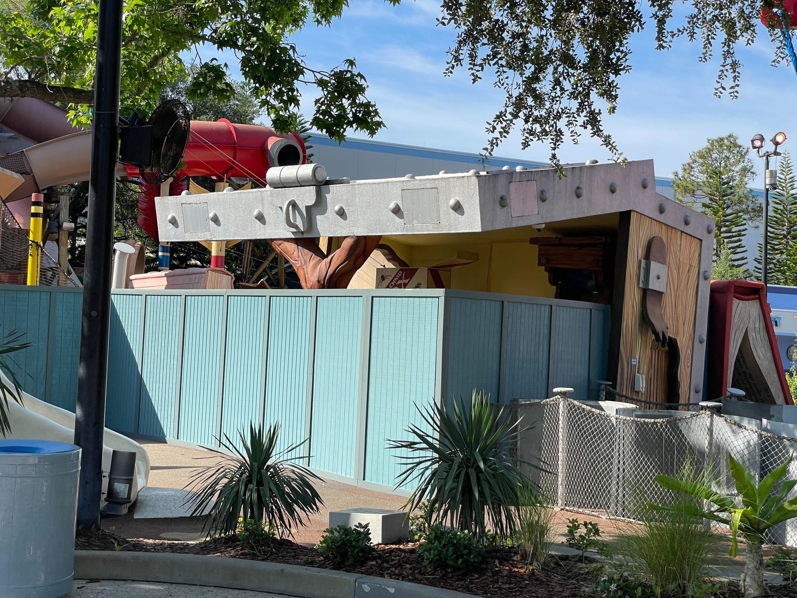 Fievel’s Playland remains closed for refurbishment at Universal Studios Florida. Construction walls now enclose the playground’s slide. Temporary fencing blocks ...