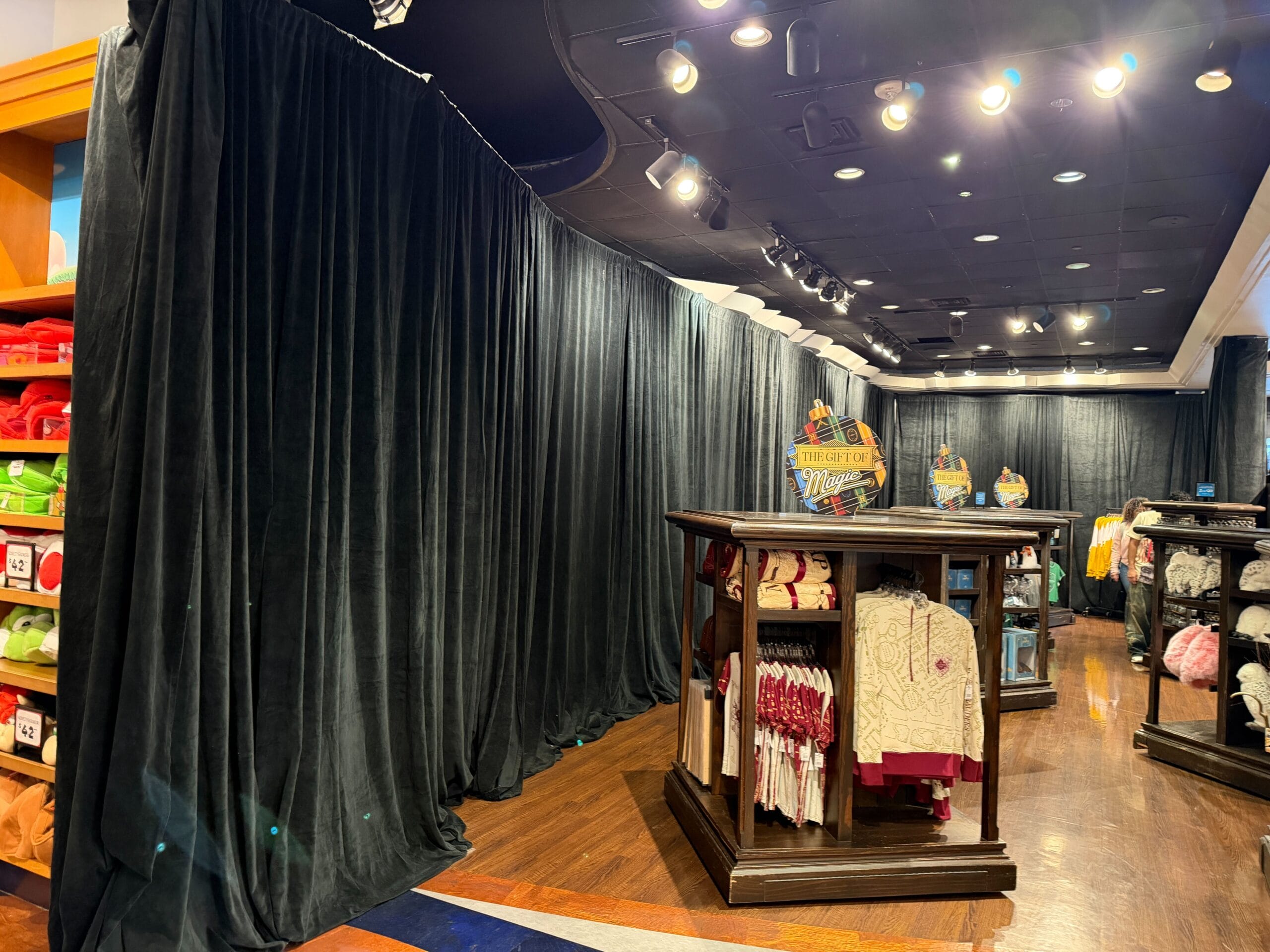 Black curtains have been installed in the Universal Studios Store at Universal Studios Florida. The curtains indicate an upcoming store ...