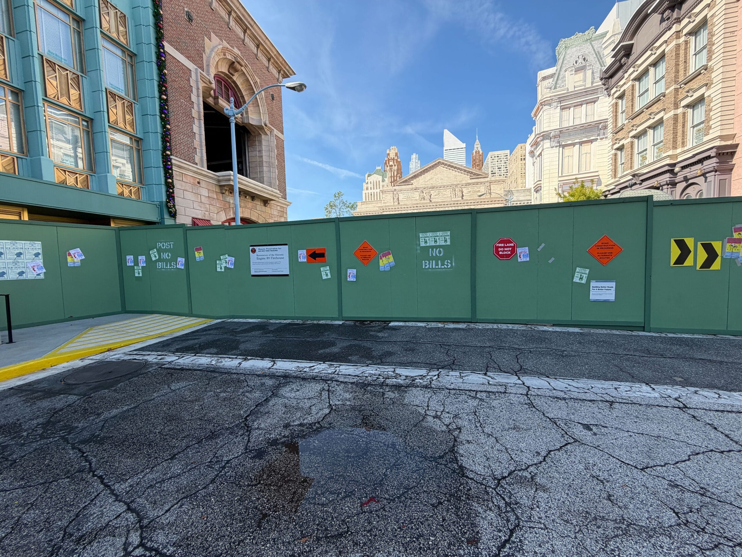 A green framework is visible above construction walls at Universal Studios Florida for a new snack kiosk. It replaces Expo ...