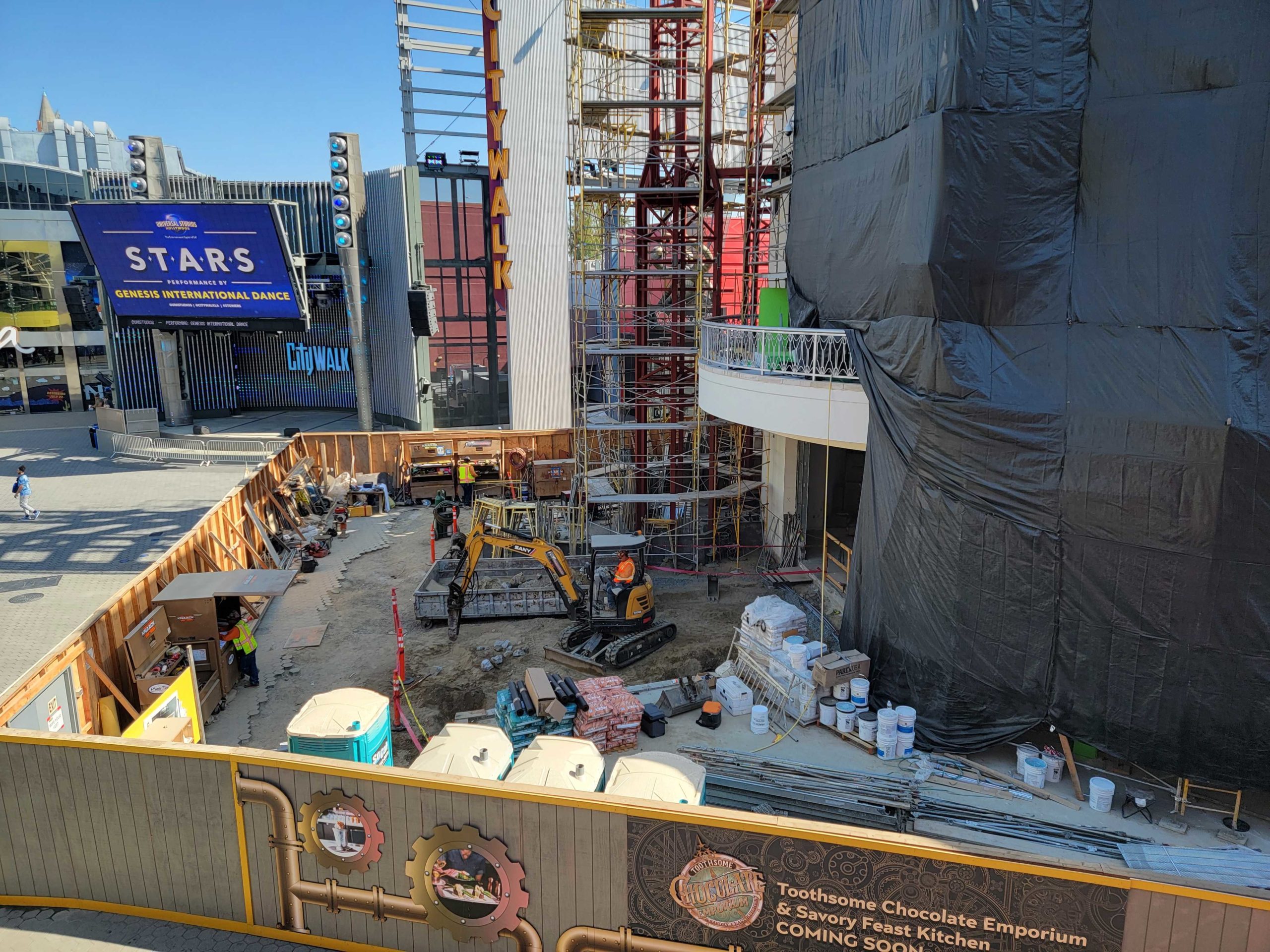 Construction Continues on Towers Outside Toothsome Chocolate Emporium & Savory Feast Kitchen at Universal CityWalk Hollywood