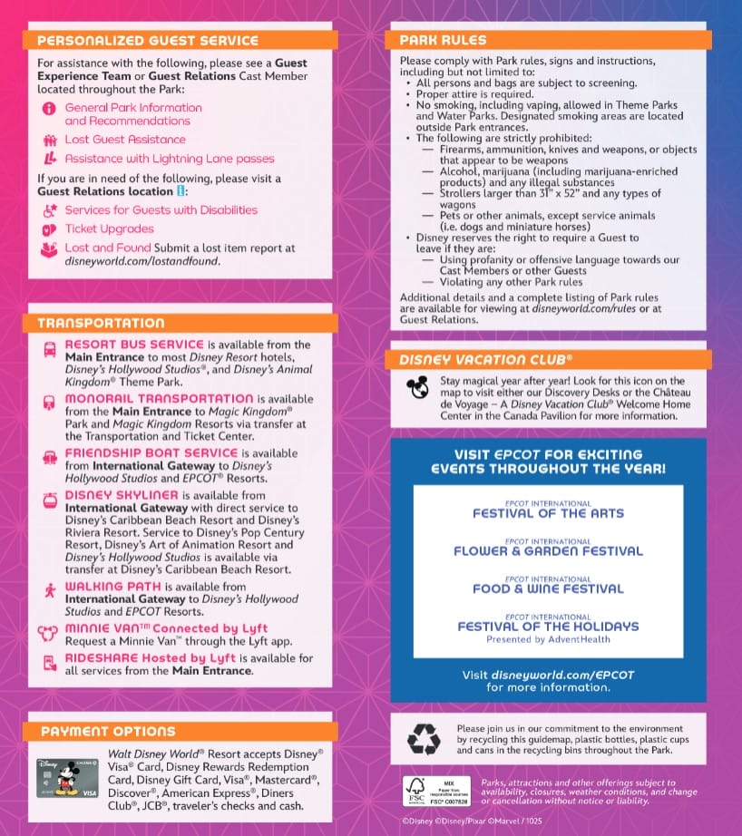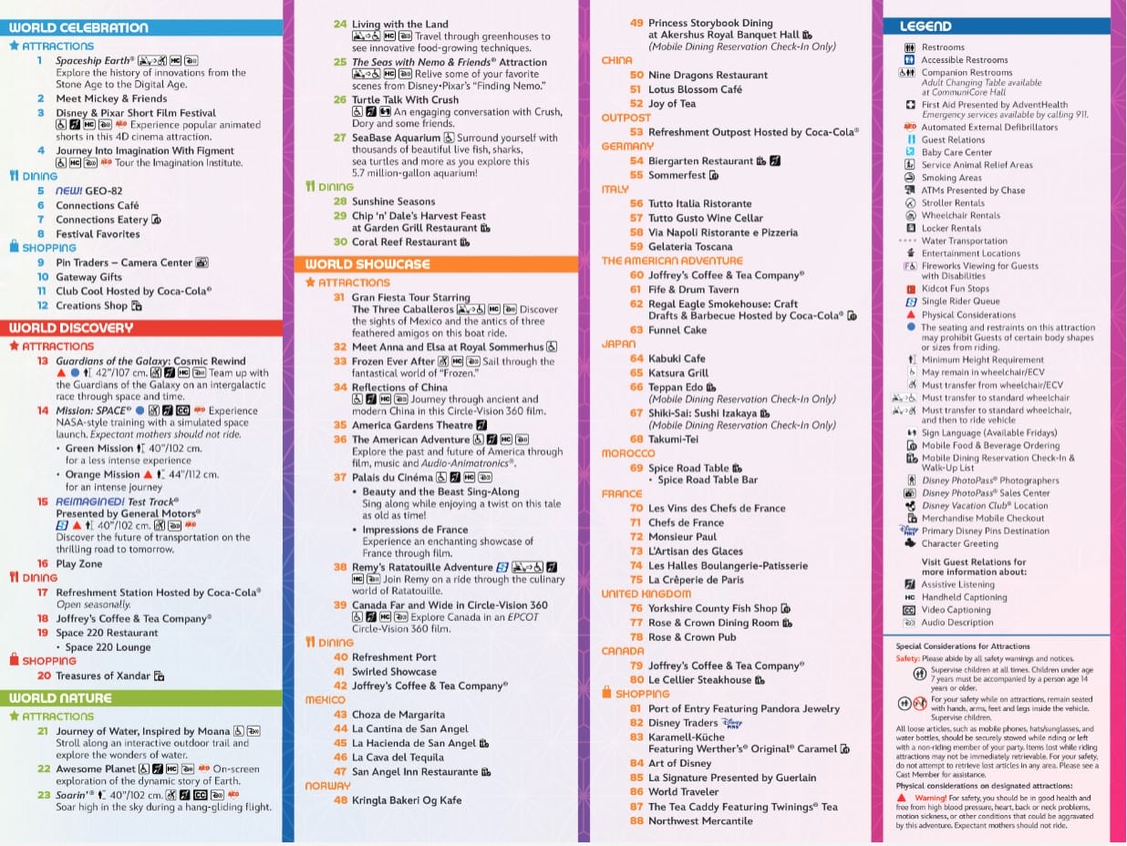 EPCOT offers comprehensive support for guests with disabilities, including attraction access information, assistive listening devices, and companion restrooms. The map of EPCOT makes it easy to locate these services throughout the park.