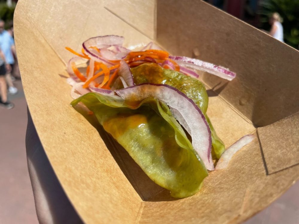 While the presentation of this dish is pretty, that’s the only compliment we can give it. The top of a dumpling should be crunchy, but this was basically a rock. It was incredibly hard to cut through and resembled what we think chewing plastic is probably like. It’s vile. It’s tough. The flavor isn’t good. This is probably one of the worst dishes we’ve had. If you’re looking for something similar, we recommend the spring rolls from the quick service in this pavilion.