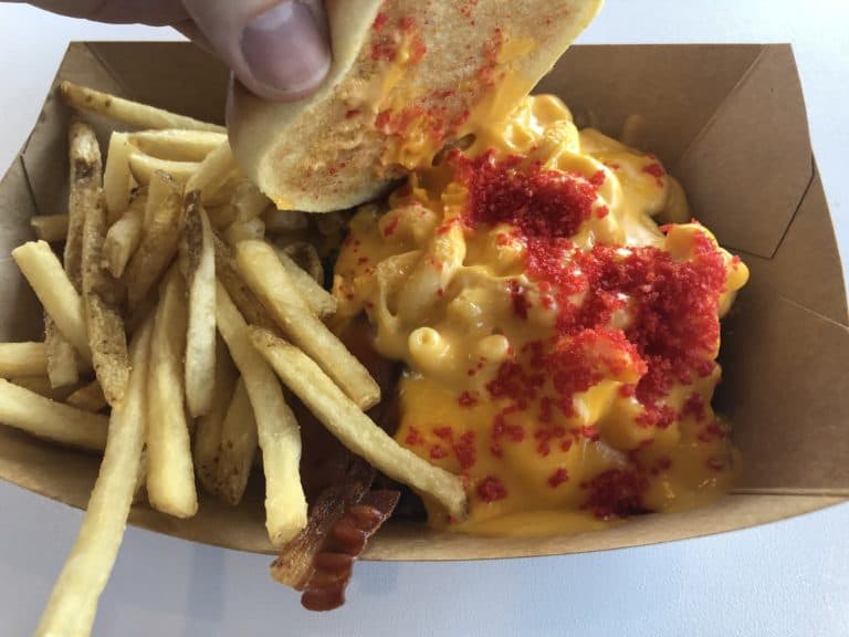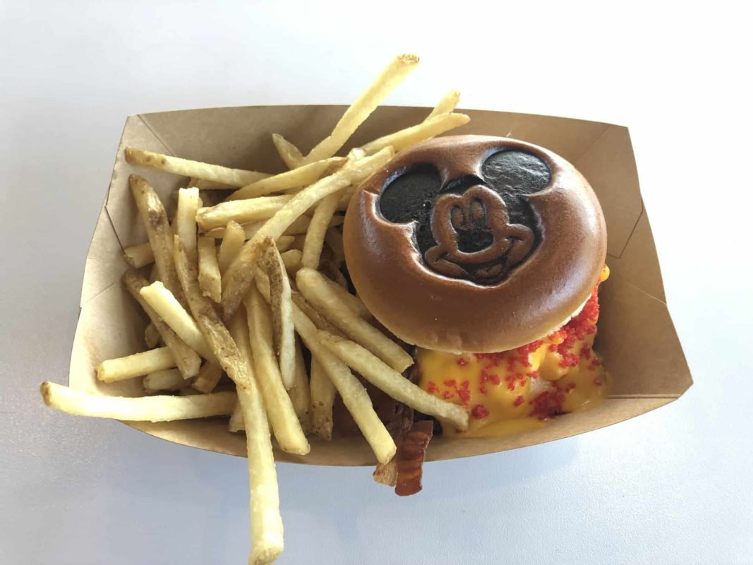 With Mickey himself branded on the top of a buttered bun, this burger is topped with macaroni and cheese, American cheese, cheese sauce, and spicy cheese dust. So yeah…it’s cheesy and, oddly enough, not terrible. While certainly a mess (a fork is more than just a suggestion here), the cheese sauce is not heavy and so it all goes down rather easily. One suggestion would be to flip over the top bun and add some mac and cheese to it. This cut down on overall thickness of the burger, providing more manageable bites.