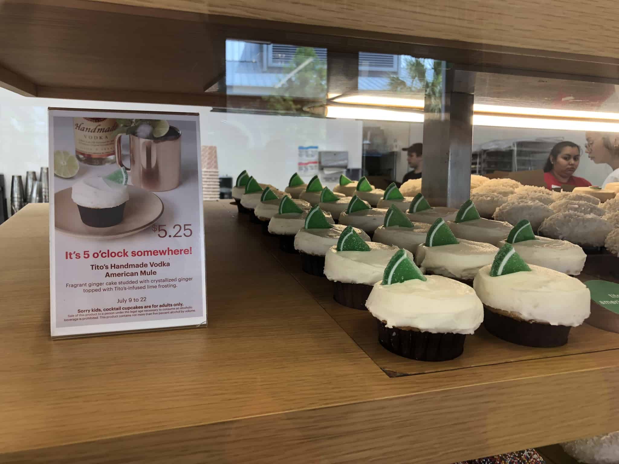 Sprinkles Cupcakes at Disney Springs offers a new soft treat made with some hard liquor. The “Tito’s Handmade Vodka American Mule” is available from today until July 22nd. It features a ginger cake frosted with the Texas based distillery’s signature vodka and studded with crystallized ginger. At less than 5% alcohol by volume, it would be quite the task to feel the alcohol impact from this sweet treat, but it is designated by store signage as an adults only cupcake. It rings in at $5.25.